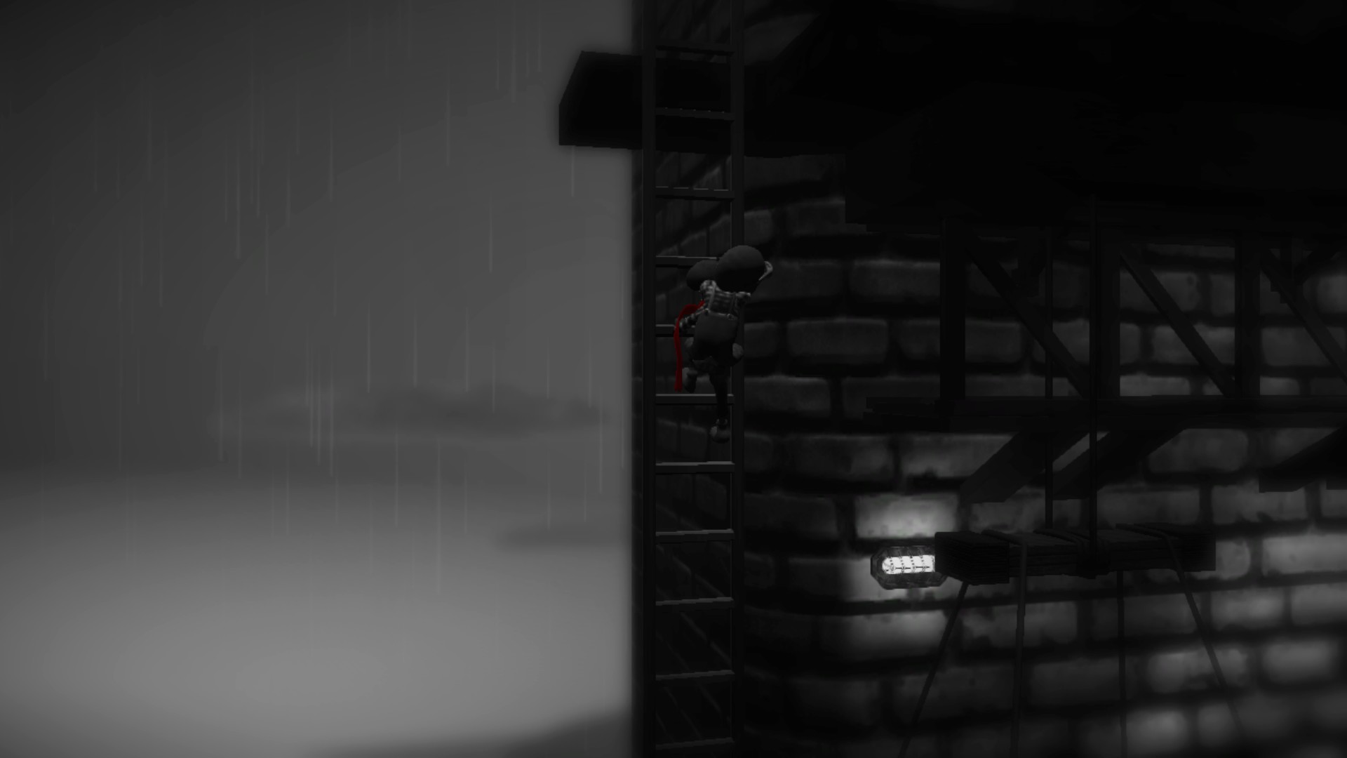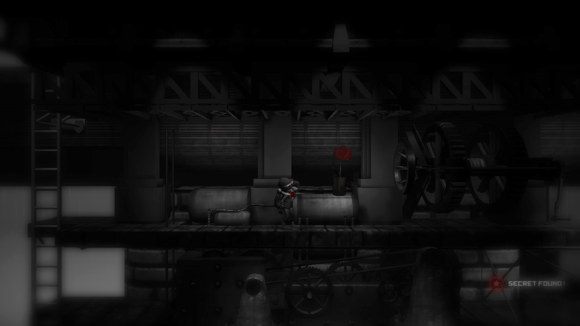 That said, the uses of monochrome in the game metaphorically went past the time period as the color red became introduced to the world. Besides giving important information like where switches and dangerous things were, the red introduced hope and familiarity to players in the forms of the two main characters - the big and little brother - the red also appears in the flowers placed throughout the levels, called 'secrets'. Out of the grim and grisly grays, secrets bring excitement and brief happiness into the dismal atmospheres that Monochroma provides.